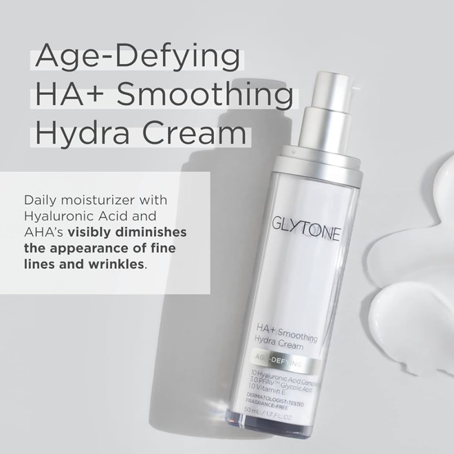 Glytone Age-Defying HA+ Smoothing Hydra Cream is an advanced daily moisturizer designed to hydrate, smooth, and reduce the appearance of fine lines and wrinkles with AHAs and Hyaluronic Acid.